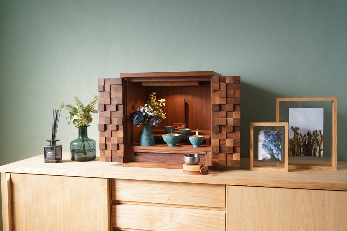 モダンな仏壇仏具の企画・販売を行う現代仏壇は、収納スペースが豊富な台付き(床置き)タイプや、棚の上に…