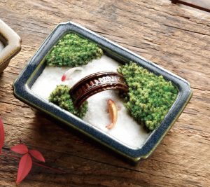 2タイプの異なる世界観は、茶系の蕎麦釉には陶器製の三重塔と溶岩石を、青系のなまこ釉には陶器製の太鼓橋と鯉のフィギュア2匹がセットされ、それぞれ自分だけの枯山水のミニ日本庭園を作ることができます。
