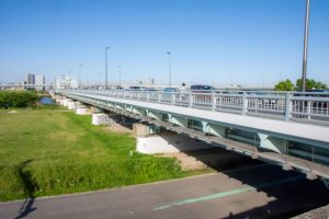 河川敷の遊歩道からは、頭上を走る首都高速中央環状線をバックにした景色や、対岸の土手を行き交う人たちの生活感溢れる風景に、夕暮れ時には夕陽を逆光に幻想的な橋のシルエットの写真まで、色々な1枚を撮ることができます。