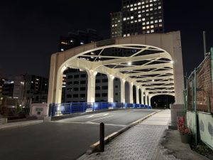 この梯子を横にしたような独特な構造を採用したのは、近くの「永代橋(Vol.7で紹介)」との景観上のバランスを保つためと云われ、重量感のある鉄骨橋梁の代表例としても貴重で、中央区民有形文化財に指定されていて、夜には淡いオレンジ色にライトアップされ、隠れた夜景スポットでもあり、たびたびドラマの撮影にも使われている。