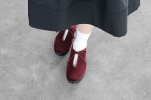 1枚仕立てのアッパーに、履口のパイピングをそのまま靴紐にしたシンプルな構造で、柔らかく上品なフォルムに蝶結びがアクセントになっている一足は、艶があるベルベットを使用しており上品な仕上がりとなっています。
