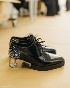 クリスタルシューズは、これまでの2つのシルエットを融合させたデザインで、メンズのオックスフォードシューズのヒール部分をプレキシ(アクリル)でX線透視したかのように表現されています。