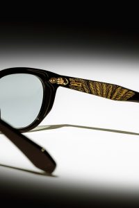 23金の金箔粉をアセテート素材に繊細に埋め込むことで、テンプルの内側にカリフォルニアを思わせるヤシの葉模様を上品に描き出し、このディテールは着用者だけが目にすることができる「密やかな美」であり、まさに「知る人ぞ知る」というオリバーピープルズのデザイン哲学を象徴しています。