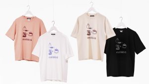 胸元のプリントはドーナツとコーヒーをメインに描かれており、ランダムに散りばめられた点や丸から隠された「顔」を探すという、遊び心あふれるデザインに仕上げられています。