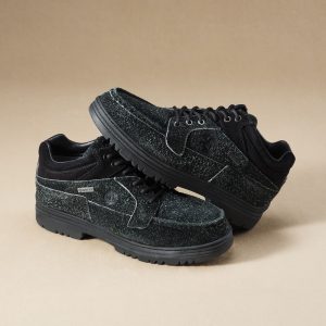 アッパーに切り返しデザインが採用され、ブラックスエードとフロック加工を施した毛足の長いスエードで構築されることで表情豊かに仕上げられました。