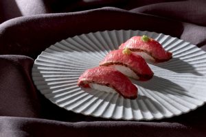 近江牛の赤肉を使用し、素材の持ち味を丁寧に引き出した、握りと炙りの2種類の異なる仕立てで楽しむことができます。