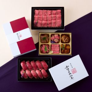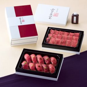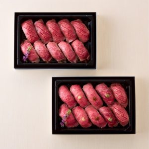 一口ごとにとろける肉寿司と、直火製法で赤身の旨味を引き立てたローストビーフの華やかで上品な組み合わせは、特別な日の食卓や贈り物に最適な一品です。