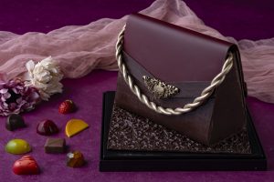 全てチョコレートで出来たハンドバック型のチョコレート細工は、なめらかなレザーの質感を表現し、高級バッグをモチーフに仕上げられました。