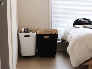 「好きな場所にらくらく動かせること」と「インテリアに馴染むデザイン」が人気となり大ヒットした「キャスター付き収納」は、ワイドタイプ・スリムタイプの2サイズで展開され、どちらもまるでバケツのような大容量ながら、不思議とリビングに溶け込んでくれます。