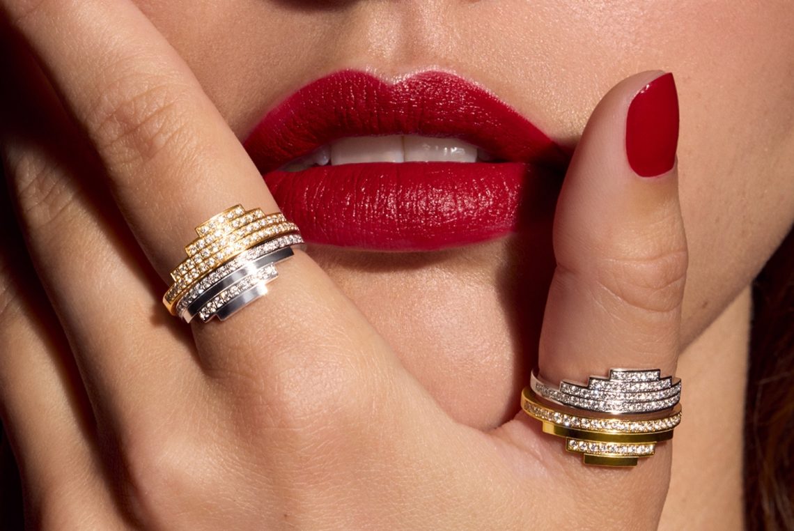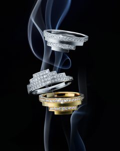 洗練された輝きを放ち、空間に艶やかな美しい光と影を与えるシャンデリアから着想を得た、アーカーのアイコンジュエリー「シャンデリア」。
