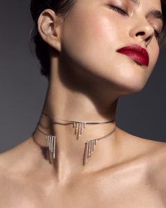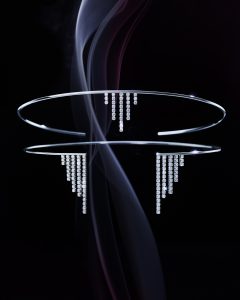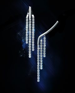 ファインジュエリーのシャンデリアは、光を受けて輝くテニスチェーンの優美なフォルムと軽やかな揺れ感が魅力で、プラチナのピュアな輝きは、ダイヤモンドの透明感と煌めきを惹き立て、香り立つような美しさを感じさせてくれます。