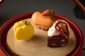 パティシエこだわりのスイーツは、葡萄や和栗など秋を代表する人気の食材をはじめ、かぼちゃ、蓮根、人参などの野菜を見た目も愛らしい秋色スイーツの数々に仕上げ、セイボリーやアミューズにも旨みや甘さが凝縮した秋の旬をたっぷりと味わえます。