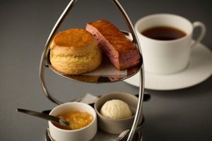 シンプルながらも香ばしく焼き上げた定番の味「プレーンスコーン」と、紫芋ペーストを練りこんだ生地に、さつま芋の甘露煮を加えたやさしい甘さの「紫芋のスコーンスコーン」には、クロテッドクリームと自家製リンゴジャムが添えられます。
