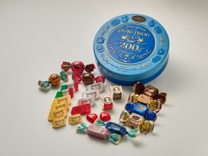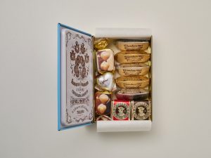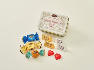 200周年を記念した缶のデザインは、1885年にカファレルで使用されていた請求書からインスパイアされたデザインとホワイトベースに繊細な線画が上品さを引き立たせる、クラシカルな缶で、中には定番のジャンドゥーヤやジャンドゥーヤビター、クレミノキューブなど9粒をアソート。