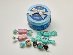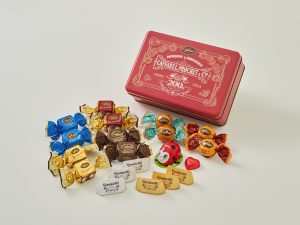 当時の新聞に掲載されたカファレルの広告をベースにした、歴史を感じられるアンティークなデザイン缶の中には、定番のジャンドゥーヤやジャンドゥーヤビター、クレミノキューブやソルテッドキャラメルなどカファレルを満喫できる全26粒をアソート。