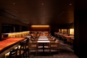 メインロビーから続く3階に位置するFUDOの店内は、バーカウンターとテーブル席で構成される落ち着いた隠れ家のような雰囲気に、オープンキッチンに近い席では、臨場感あふれるシェフの調理風景を間近に楽しむことができます。