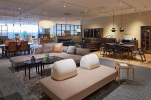 ショールームの空間構成が見直され、ゆとりある十分な広さを確保することで、家具同士の間隔や動線にも配慮し、実際の住まいに近いスケール感で体感できる環境が整っています。