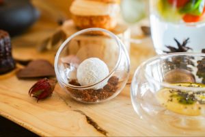 施設の象徴である球体テントをイメージしたチョコレートの「球体テントトリュフ」は、外側のチョコの中に液体を包み込んでいて、一口でいただくことができます。