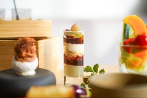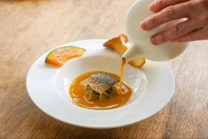 また、セイボリーには、バターチキンカレー、長谷川園キノコ、ミニクロックムッシュに、特に注目は秋刀魚と茄子のタルタルで、秋刀魚を骨や肝ごと煮込んだスープと一緒にいただくと、すだちの爽やかな香りと肝のほろ苦さが重なり合い、奥行きのある味わいに、あたたかいスープによって香りが立ちのぼり、五感で楽しめる一品です。