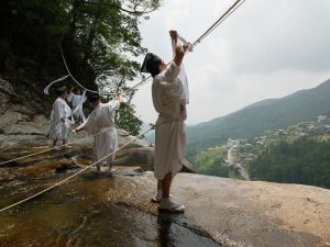 那智の滝の落ち口に掛けられている注連縄は、毎年7月の例大祭「那智の扇まつり」前に張替えが行われます。