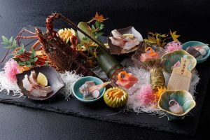 旬の魚介を盛り合わせ、見た目の美しさと躍動感を意識して仕上げられる御造りは、使用する魚介は時期に応じて変わり、イセエビや豊後まぐろ、関あじ、イサキ、生雲丹など、その季節にあった食材が提供されます。