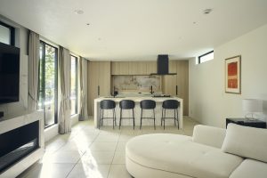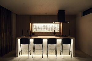 大型ソファに白亜のアイランドキッチンが完備され、複数人での対話にも、ひとりでの内省にも対応する余白のある空間です。