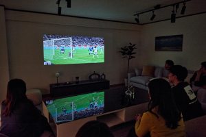 リビングには、10名がゆったりとくつろげる大型ソファと、壁一面に広がる大画面プロジェクターが設置され、プライベートシアターのような没入感で映画や動画を楽しめるほか、冬場も快適な全面床暖房を完備しています。