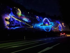 花巻駅北側の高さ10m、長さ80mの擁壁に、光で浮かび上がる幻想的な「未来都市銀河地球鉄道」の絵は、「銀河鉄道の夜」をイメージして描かれました。